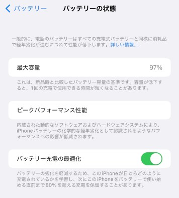 最大容量はiPhoneが新品の時と比較したバッテリー容量の基準です。新品時の最大容量は100%で、劣化が進むと最大容量が低下し、一回の充電で使用できる時間が短くなる事があります。